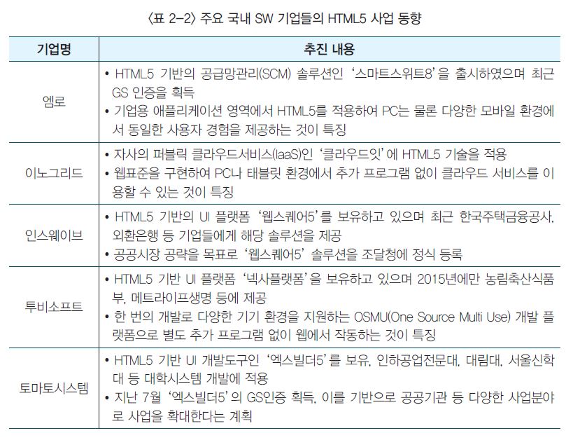 - 그에 따라 국내 SW기업들의 HTML5 기반 솔루션 수요가 늘고 있으며 기업들의 HTML5 기술 개발 및 관련 제품 출시가 잇따라 진행