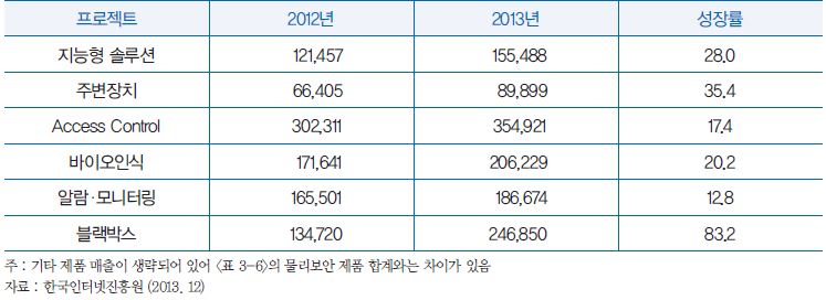 제품 시장 중 IP영상장치, Solution, 바이오인식, 주변장치 등 ICT 기반 제품들의 매출이 2012년 대비 20% 이상의 성장률을 보여 물리보안 시장에서 ICT 융합이 강화