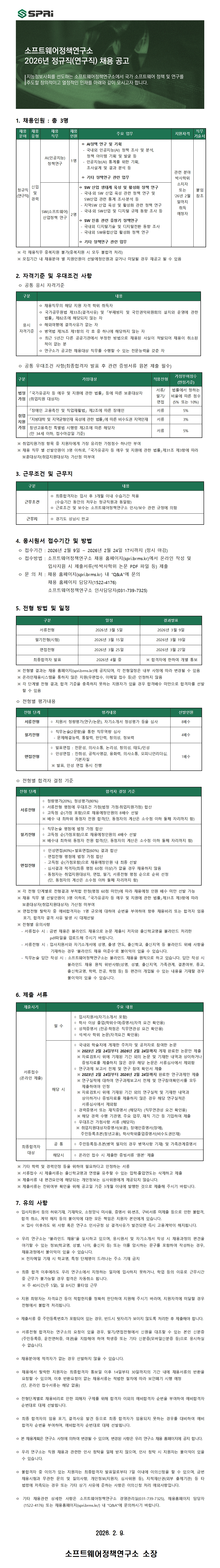 소프트웨어정책연구소 2026년 정규직(연구직) 채용