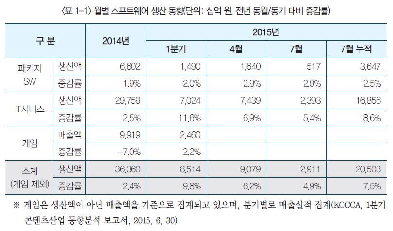 - (패키지소프트웨어) 7월 패키지소프트웨어는 전년 동월 대비 2.9% 증가한 5,173억 원으로 집계, 7월 누적 패키지 소프트웨어 생산액은 전년 동기 대비 2.5% 증가