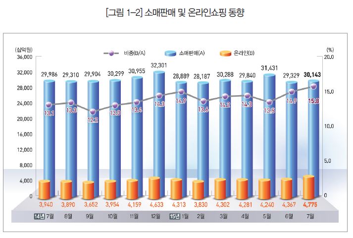 - 2015년 7월 국내 소매판매액은 전년 동월 대비 0.5% 증가했으나 온라인 쇼핑 거래액은 21.2% 증가