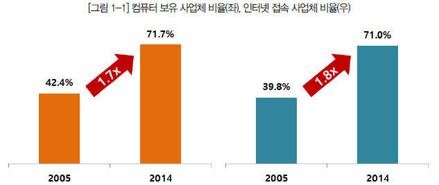 - - 인터넷 접속 사업체 비율은 2005년 전체 사업체 중 39.8%(약 126만 개)에서 2014년엔 71.0%(약 261만 개)로 약 1.8배 증가