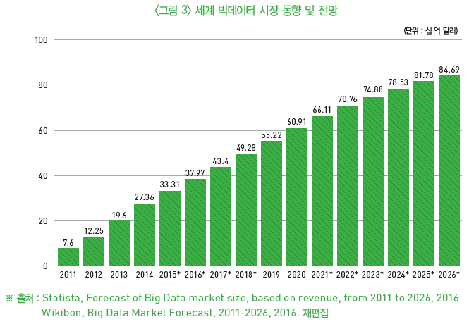 - 세계 빅데이터 시장은 현재도 성장 중이며, 시장조사기관 마다 규모의 차이는 다소 있으나 공통적으로 높은 성장률을 예측