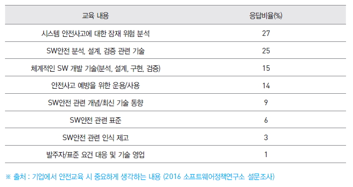 안전에 대한 인식 및 기술 역량이 낮은 신기술 분야는 소프트웨어 안전 인식 제고 교육 및 소프트웨어 안전 기초 지식 교육을 해야 한다. 안전이 보다 중요시 되는 소프트웨어 융합 분야는 소프트웨어 안전 표준을 정립하고 교육하는 것이 필요하다. 특히 중소기업은 교육으로 인한 업무 부담을 최소화할 수 있는 방안을 마련하여 소프트웨어 안전 인식 제고에 대한 교육부터 필요하다.