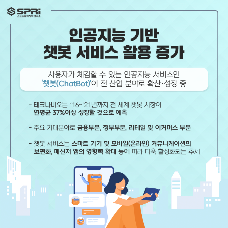 인공지능 기반 챗봇 서비스 활용 증가  o 사용자가 체감할 수 있는 인공지능 서비스인 ‘챗봇(ChatBot)’이 전 산업 분야로 확산·성장 중  - 테크나비오는 ′16~′21년까지 전 세계 챗봇 시장이 연평균 37%이상 성장할 것으로 예측  - 주요 기대분야로 금융부문, 정부부문, 리테일 및 이커머스 부문  - 챗봇 서비스는 스마트 기기 및 모바일(온라인) 커뮤니케이션의 보편화,  메신저 앱의 영향력 확대 등에 따라 더욱 활성화되는 추세