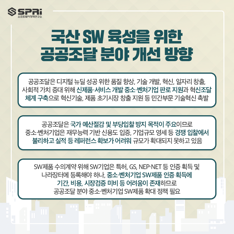 중소·벤처기업 SW제품 인증 획득에 기간, 비용, 시장검증 미비 등 어려움 존재하므로 공공조달 분야 중소·벤처기업 SW제품 확대 정책 필요